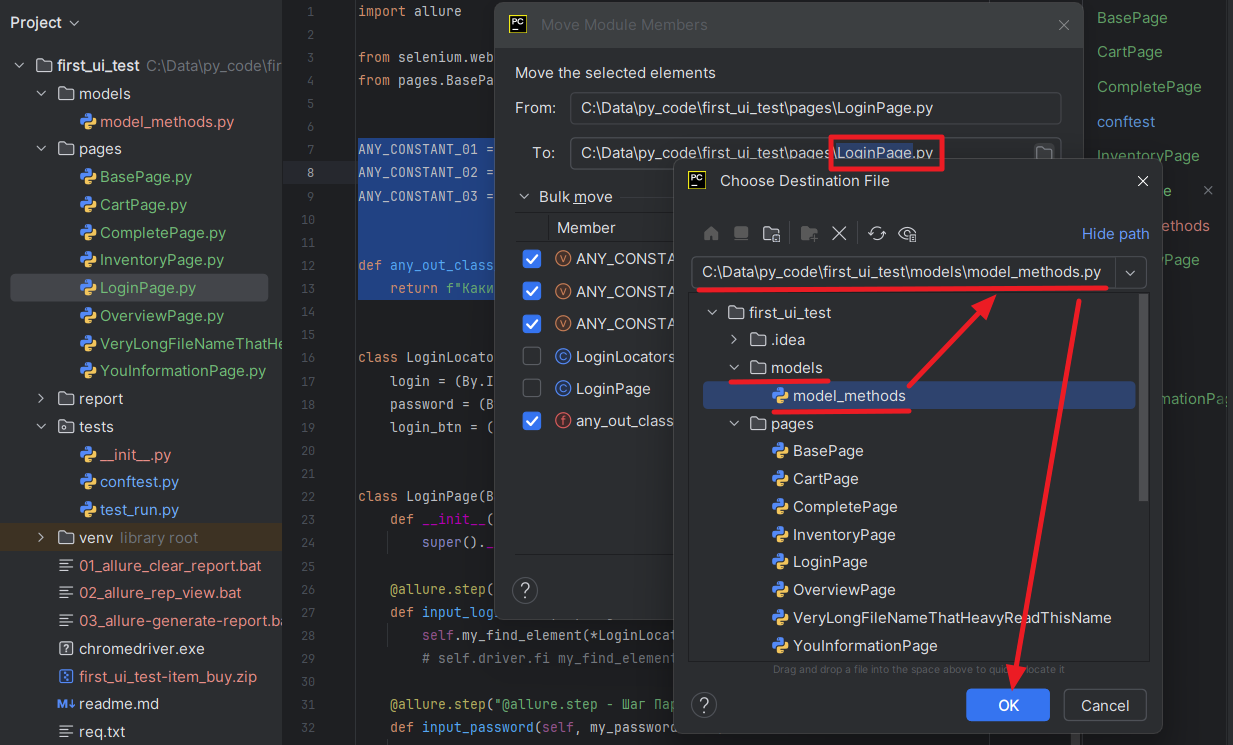 5. Указываем путь к файлу в который будут переноситься блоки кода и нажимаем кнопку OK: