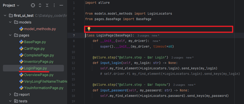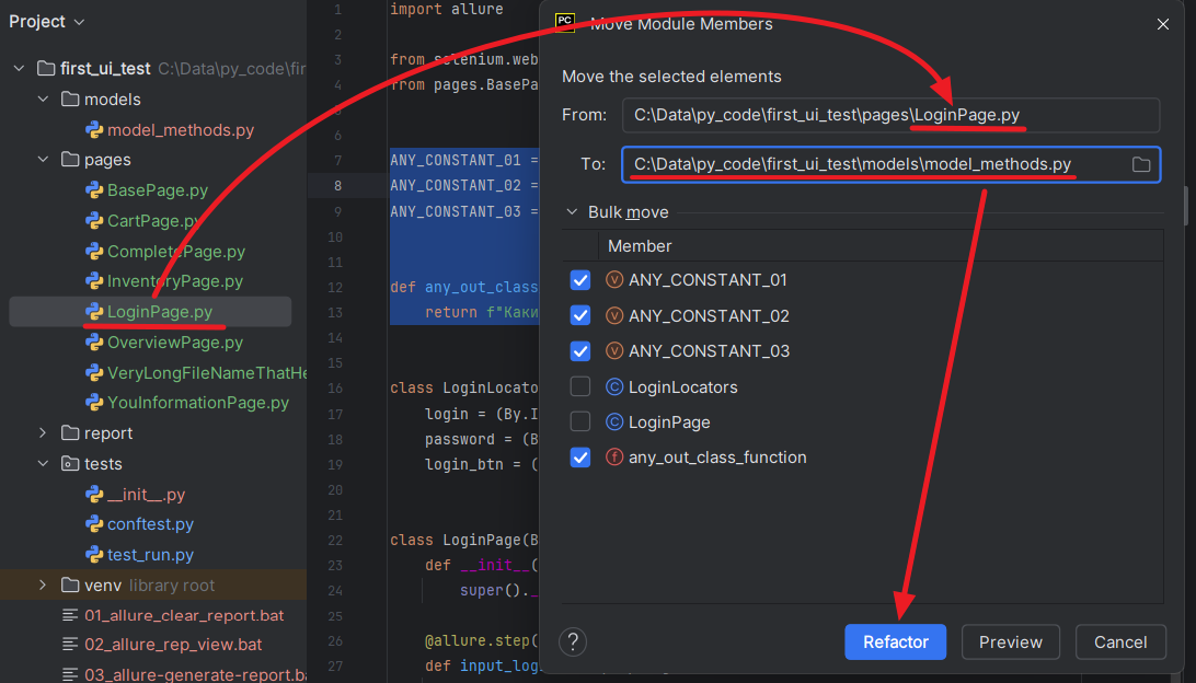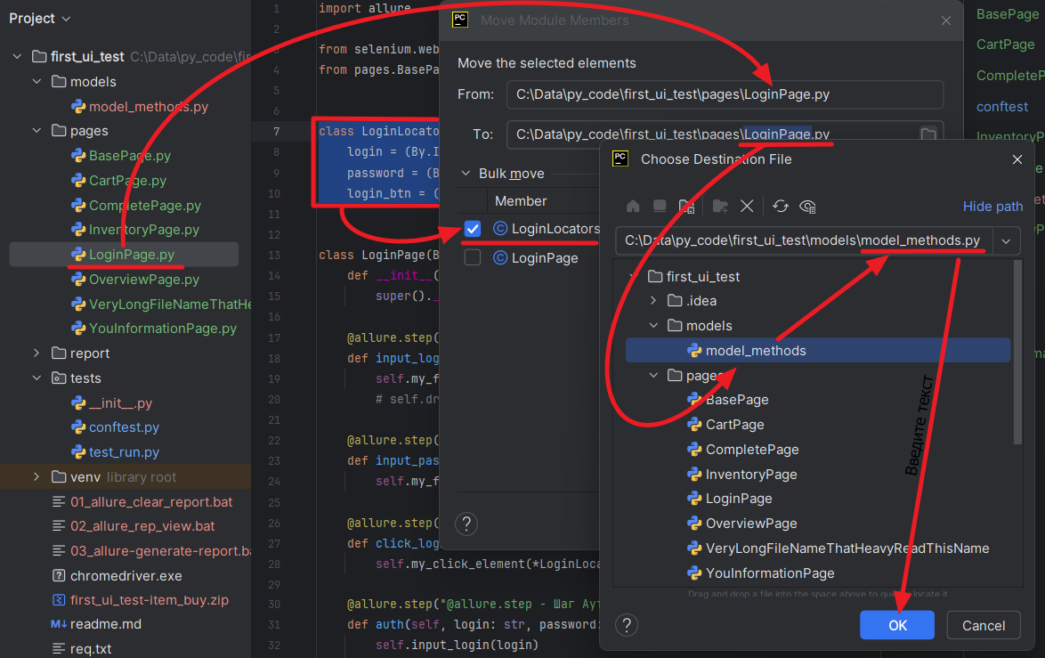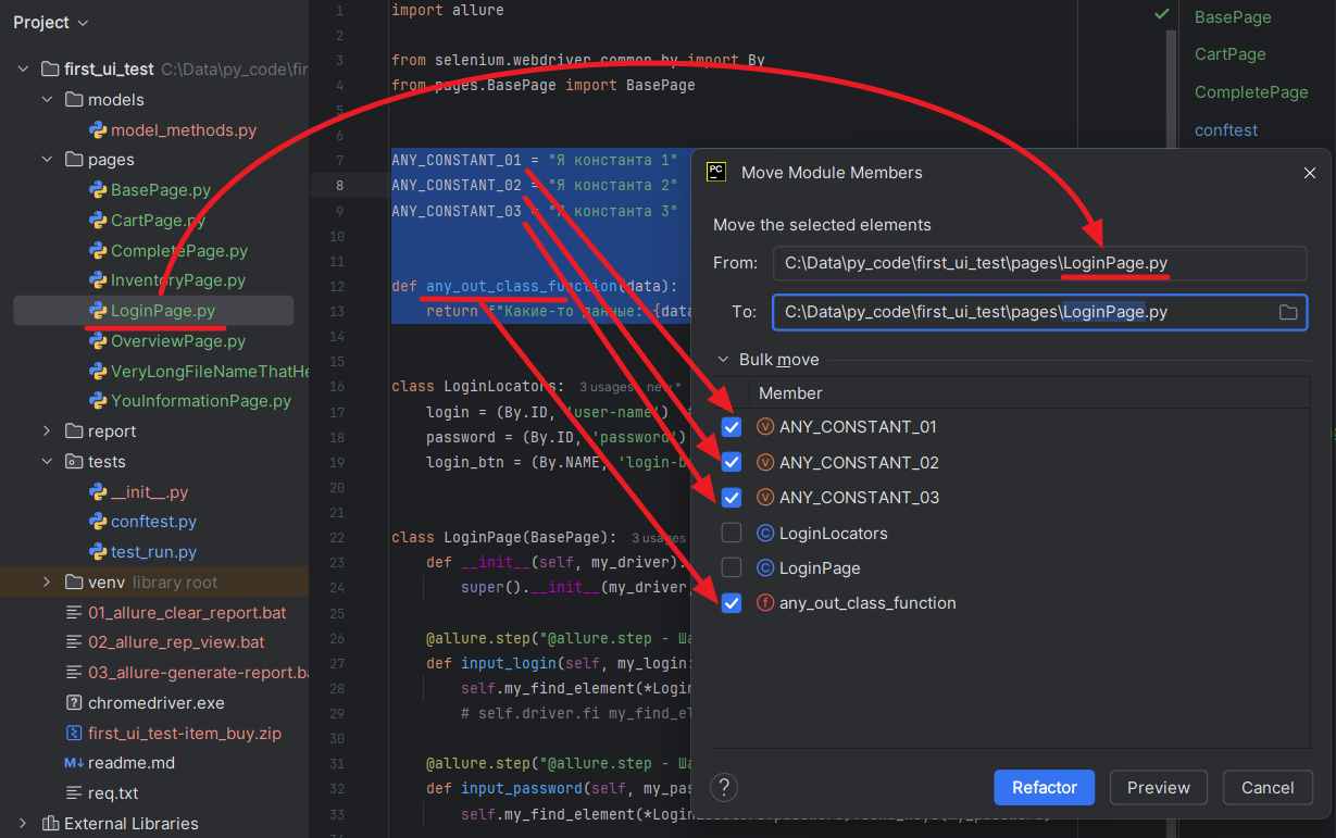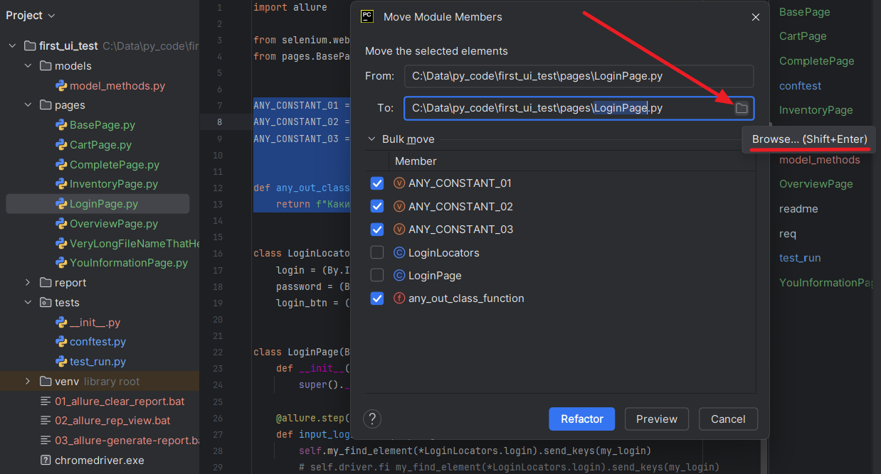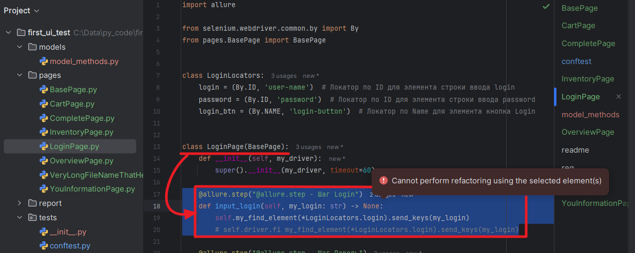 9. Есть естественные ограничения на перенос кода. Если мы попробуем перенести отдельный метод класса, то ничего не получится. PyCharm не знает как ему поступить в таком случае: