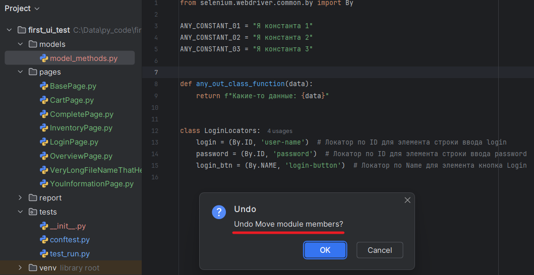 13. Произведённые действия по рефакторингу, можно отменить, нажав горячие клавиши Ctrl+Z. Мы увидим запрос на подтверждение наших действий: