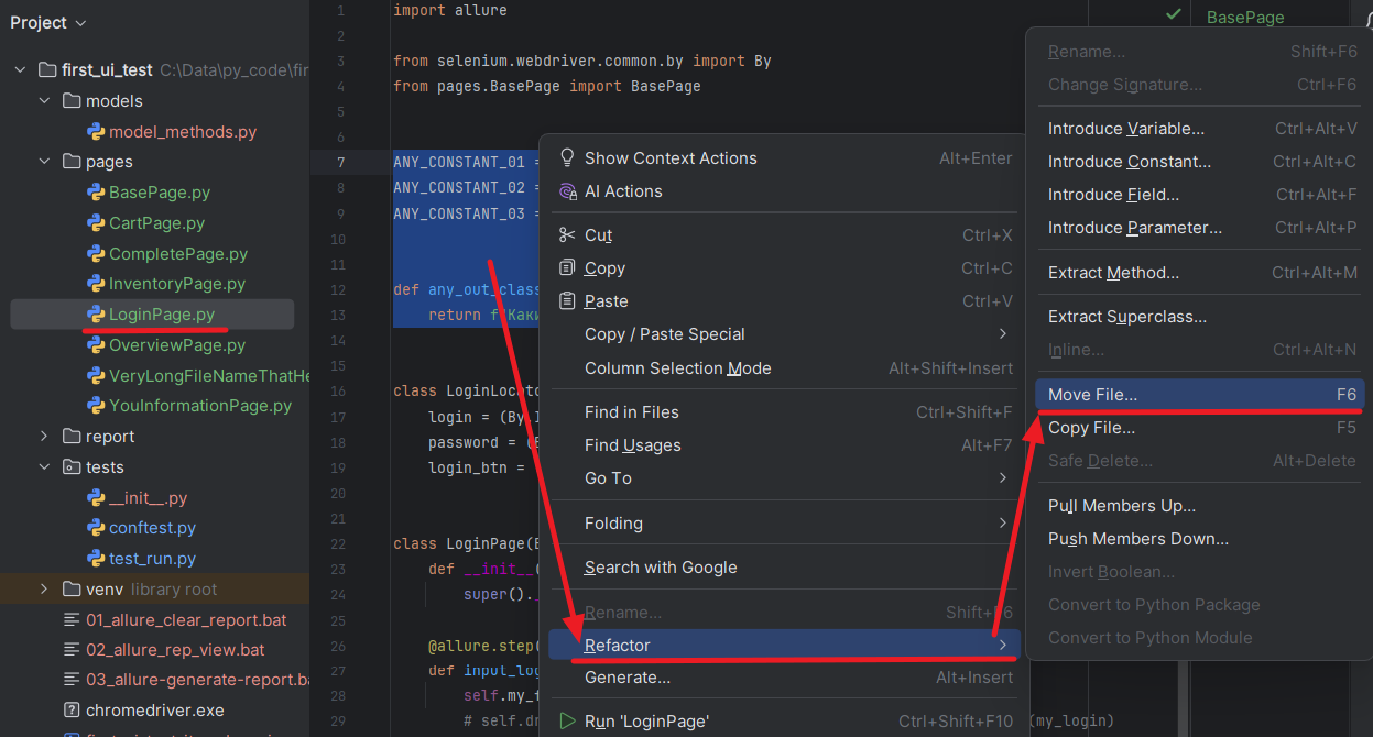 2. На выделении (выделенном блоке) нажмите правую кнопку мыши. Раскроется контекстное меню, в котором нужно выбрать пункт Refactor, который раскроется в дополнительное меню, в котором нужно выбрать пункт Move File... (также, после выделения блока можно было нажать горячую клавишу F6).